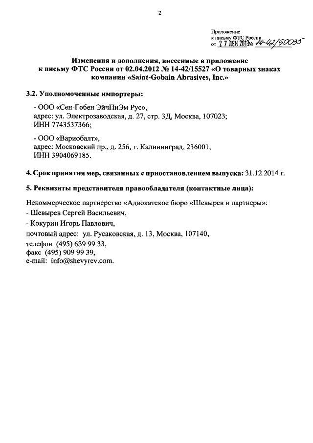 "О ВНЕСЕНИИ ИЗМЕНЕНИЙ В ПИСЬМО ФТС РОССИИ ОТ 02.04.2012 N 14-42/15527"