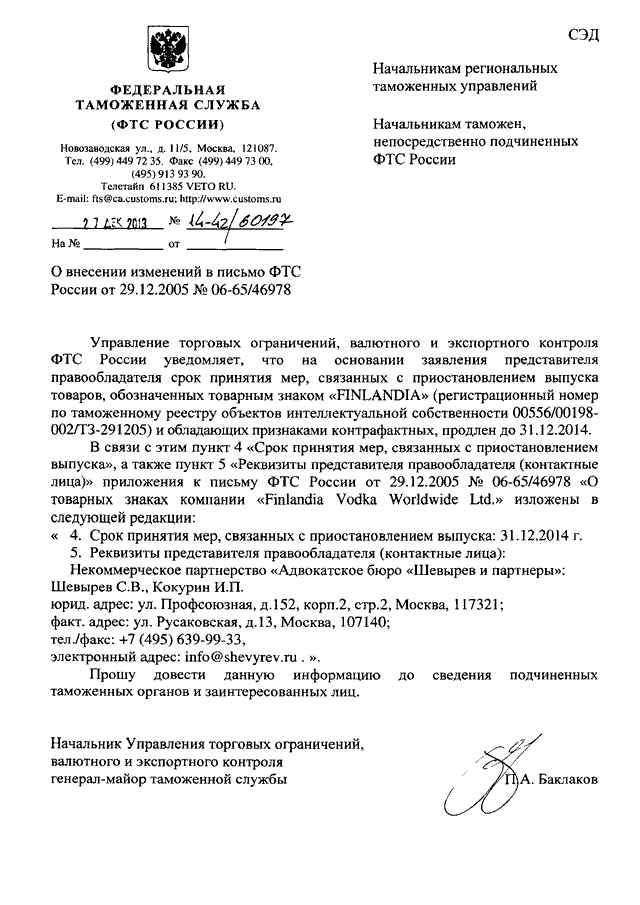ПИСЬМО ФТС РФ от 27.12.2013 N 14-42/60197