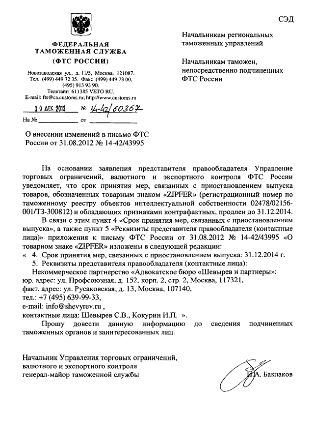 ПИСЬМО ФТС РФ от 30.12.2013 N 14-42/60367