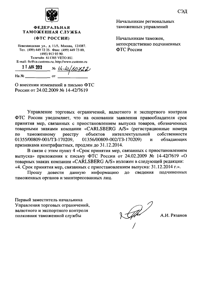 "О ВНЕСЕНИИ ИЗМЕНЕНИЙ В ПИСЬМО ФТС РОССИИ ОТ 24.02.2009 N 14-42/7619"