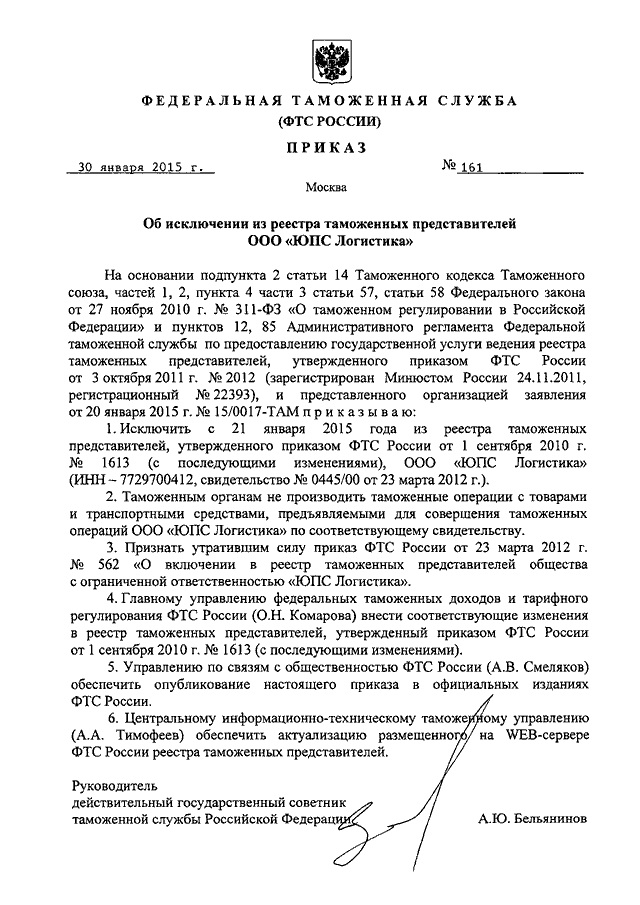ПРИКАЗ ФТС РФ от 30.01.2015 N 161