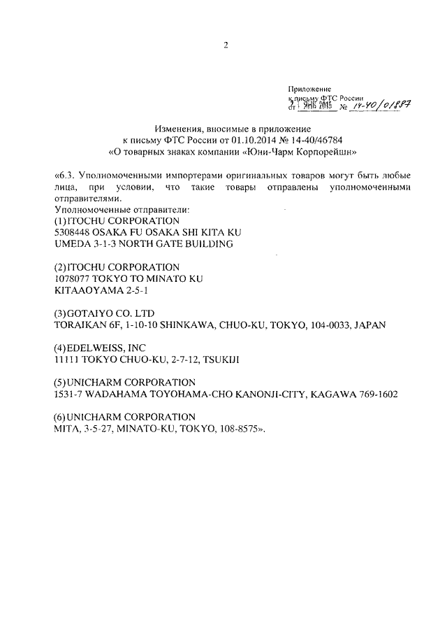 "О ВНЕСЕНИИ ИЗМЕНЕНИЙ В ПИСЬМО ФТС РОССИИ ОТ 01.10.2014 N 14-40/46784"