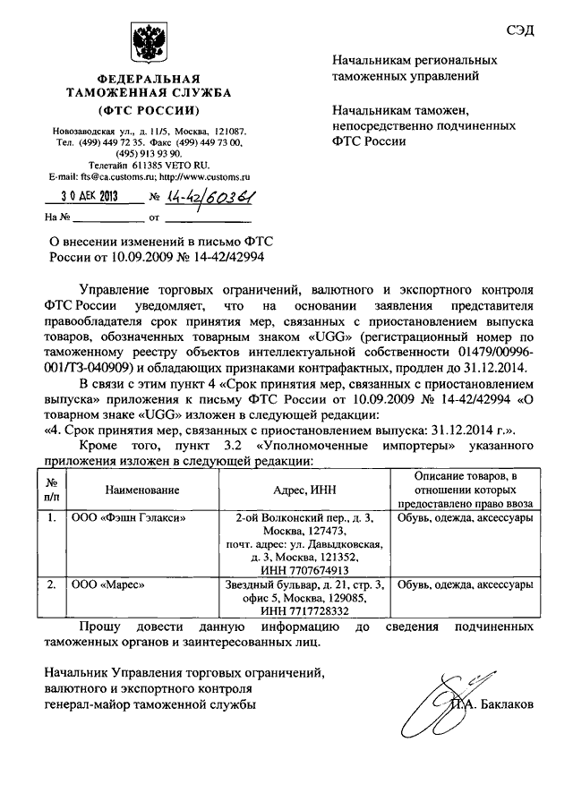ПИСЬМО ФТС РФ от 30.12.2013 N 14-42/60361