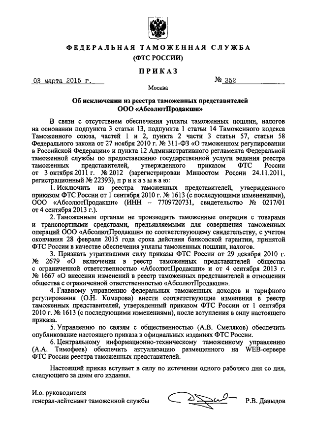 ПРИКАЗ ФТС РФ от 03.03.2015 N 352
