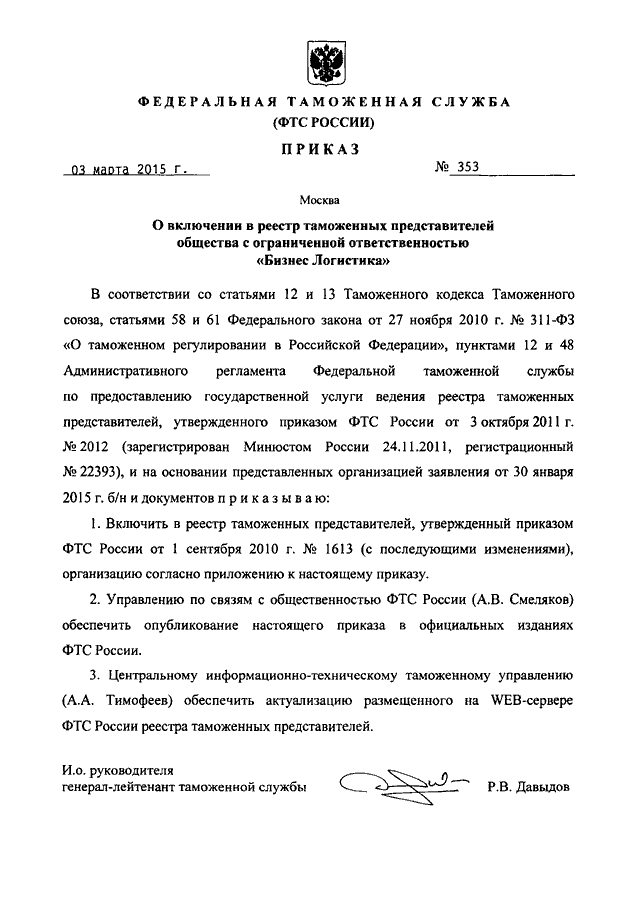 ПРИКАЗ ФТС РФ от 03.03.2015 N 353