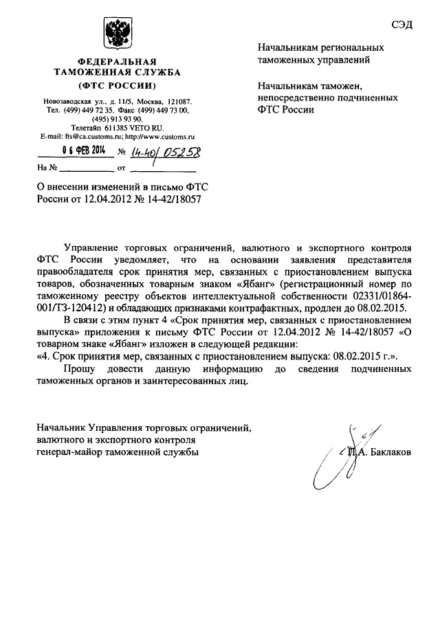ПИСЬМО ФТС РФ от 06.02.2014 N 14-40/05258
