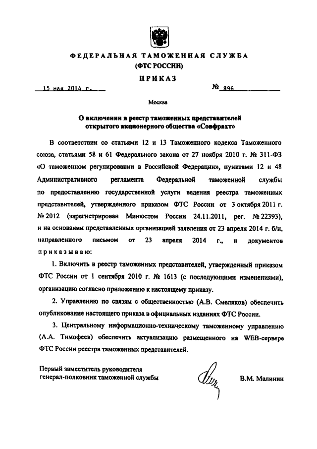 ПРИКАЗ ФТС РФ от 15.05.2014 N 896