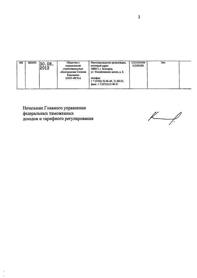 "О ВКЛЮЧЕНИИ В РЕЕСТР ТАМОЖЕННЫХ ПРЕДСТАВИТЕЛЕЙ ОБЩЕСТВА С ОГРАНИЧЕННОЙ ОТВЕТСТВЕННОСТЬЮ "БЕЛГОРОДСКАЯ СОЛЯНАЯ КОМПАНИЯ" (ООО "БСК")"