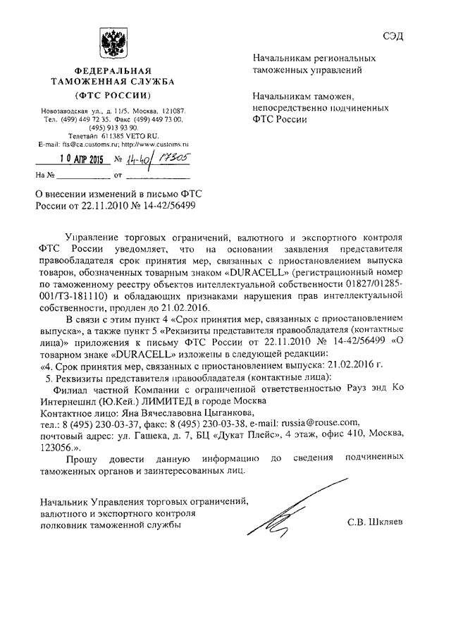 ПИСЬМО ФТС РФ от 10.04.2015 N 14-40/17305