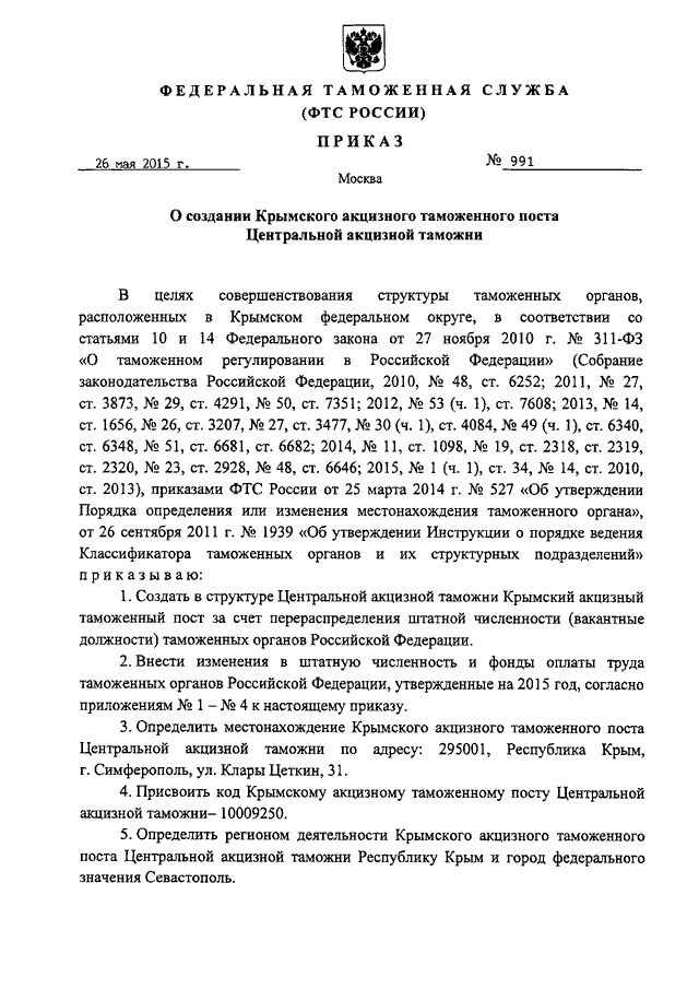 ПРИКАЗ ФТС РФ от 26.05.2015 N 991