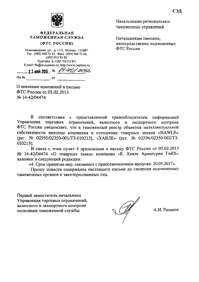 ПИСЬМО ФТС РФ от 22.05.2015 N 14-40/24392