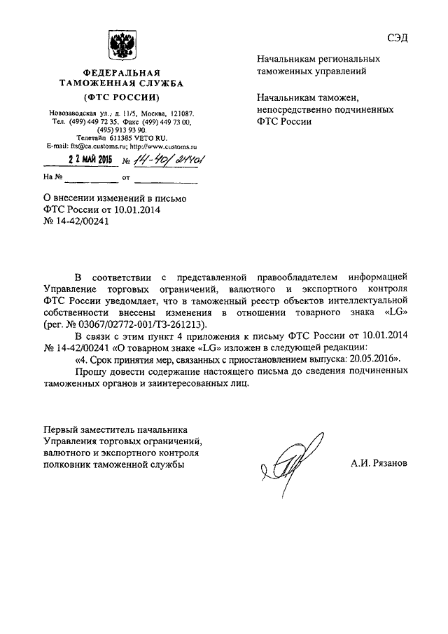 "О ВНЕСЕНИИ ИЗМЕНЕНИЙ В ПИСЬМО ФТС РОССИИ ОТ 10.01.2014 N 14-42/00241"