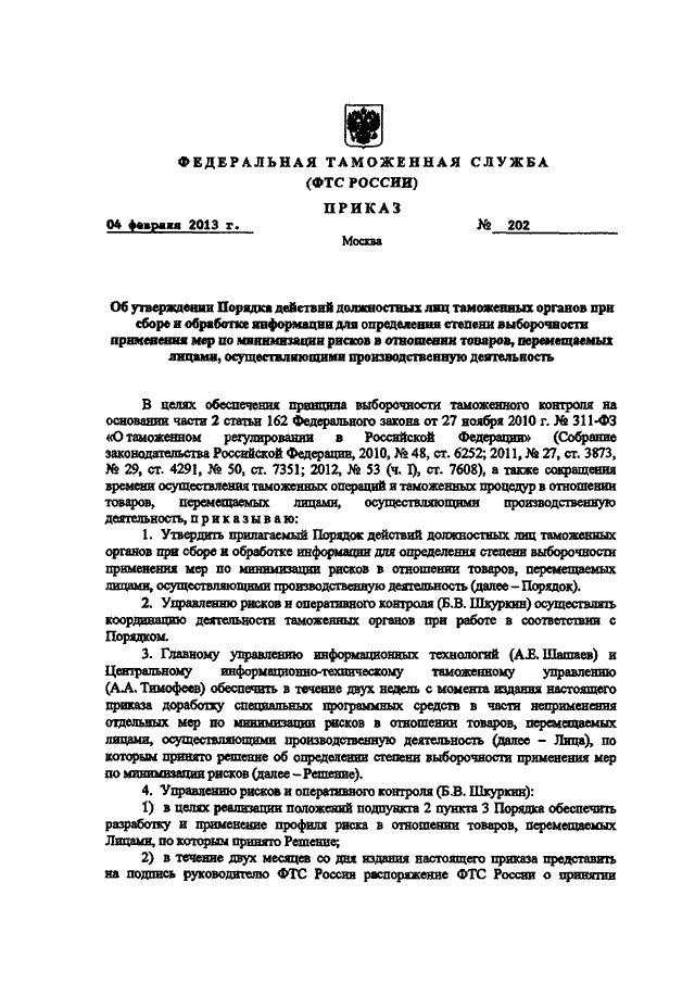 ПРИКАЗ ФТС РФ от 04.02.2013 N 202
