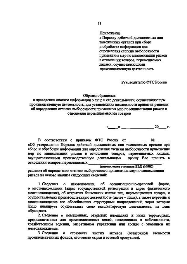 "ОБ УТВЕРЖДЕНИИ ПОРЯДКА ДЕЙСТВИЙ ДОЛЖНОСТНЫХ ЛИЦ ТАМОЖЕННЫХ ОРГАНОВ ПРИ СБОРЕ И ОБРАБОТКЕ ИНФОРМАЦИИ ДЛЯ ОПРЕДЕЛЕНИЯ СТЕПЕНИ ВЫБОРОЧНОСТИ ПРИМЕНЕНИЯ МЕР ПО МИНИМИЗАЦИИ РИСКОВ В ОТНОШЕНИИ ТОВАРОВ, ПЕРЕМЕЩАЕМЫХ ЛИЦАМИ, ОСУЩЕСТВЛЯЮЩИМИ ПРОИЗВОДСТВЕННУЮ ДЕЯТЕЛЬНОСТЬ"