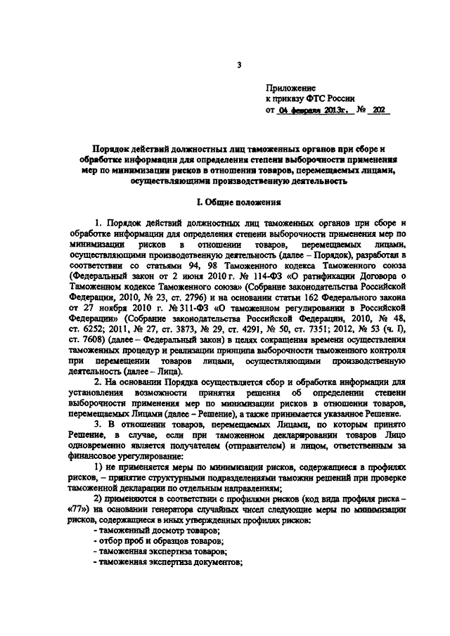 ПРИКАЗ ФТС РФ от 04.02.2013 N 202