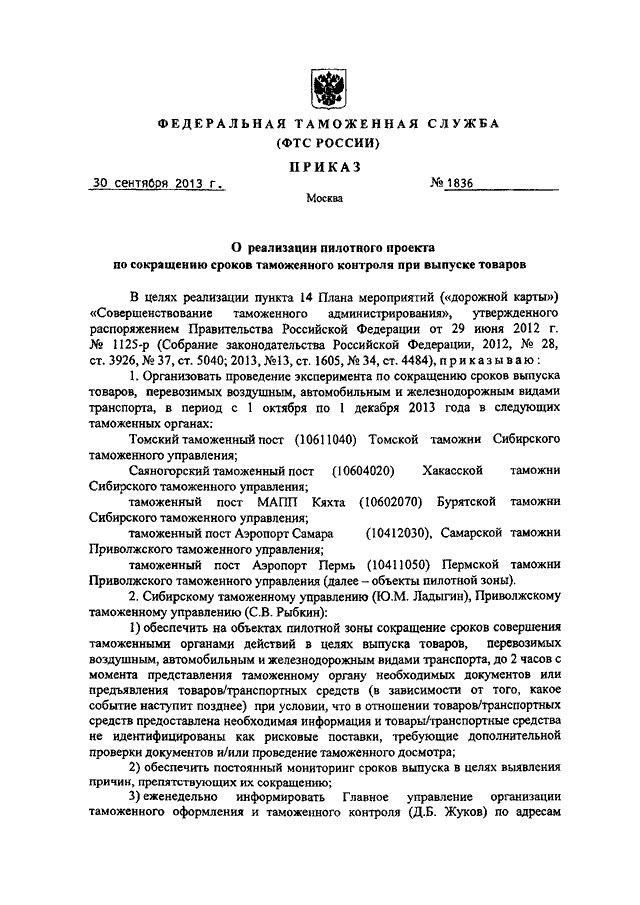 ПРИКАЗ ФТС РФ от 30.09.2013 N 1836