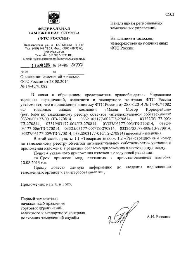 ПИСЬМО ФТС РФ от 29.05.2015 N 14-40/25837
