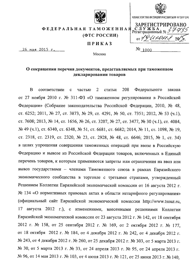 ПРИКАЗ ФТС РФ от 26.05.2015 N 1000