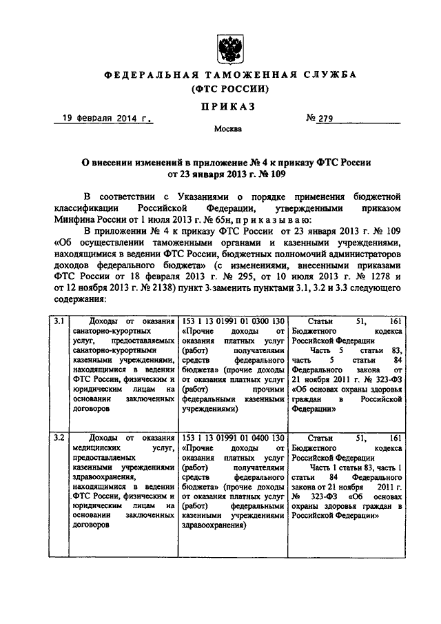 ПРИКАЗ ФТС РФ от 19.02.2014 N 279