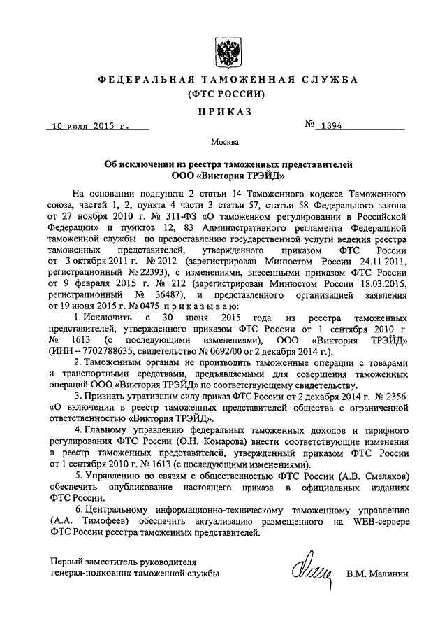 ПРИКАЗ ФТС РФ от 10.07.2015 N 1394