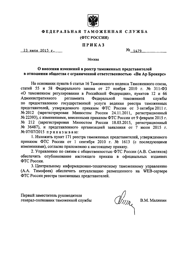 ПРИКАЗ ФТС РФ от 23.07.2015 N 1479