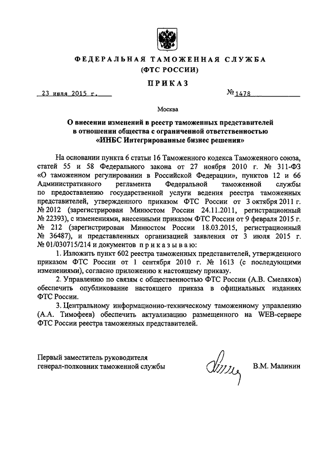 ПРИКАЗ ФТС РФ от 23.07.2015 N 1478