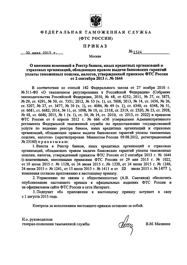 ПРИКАЗ ФТС РФ от 30.07.2015 N 1524 "О ВНЕСЕНИИ ИЗМЕНЕНИЙ В РЕЕСТР БАНКОВ, ИНЫХ КРЕДИТНЫХ ОРГАНИЗАЦИЙ
