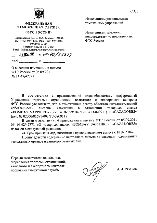 ПИСЬМО ФТС РФ от 21.07.2015 N 14-40/35389