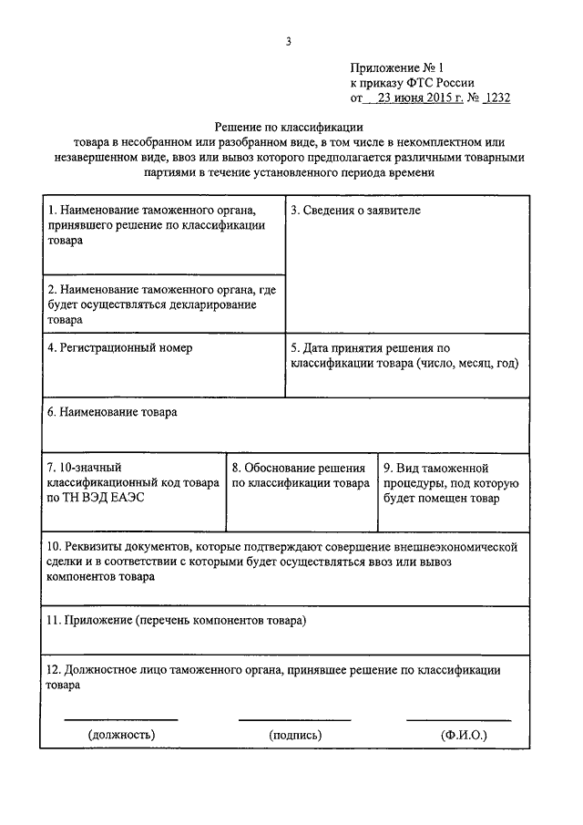 ПРИКАЗ ФТС РФ от 23.06.2015 N 1232