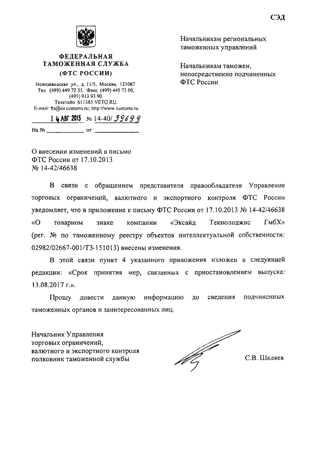 "О ВНЕСЕНИИ ИЗМЕНЕНИЙ В ПИСЬМО ФТС РОССИИ ОТ 17.10.2013 N 14-42/46638"