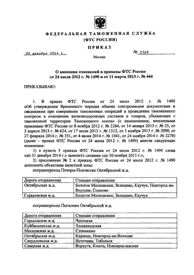 "О ВНЕСЕНИИ ИЗМЕНЕНИЙ В ПРИКАЗЫ ФТС РОССИИ ОТ 24 ИЮЛЯ 2012 Г. N 1490 И ОТ 11 МАРТА 2013 Г. N 444"