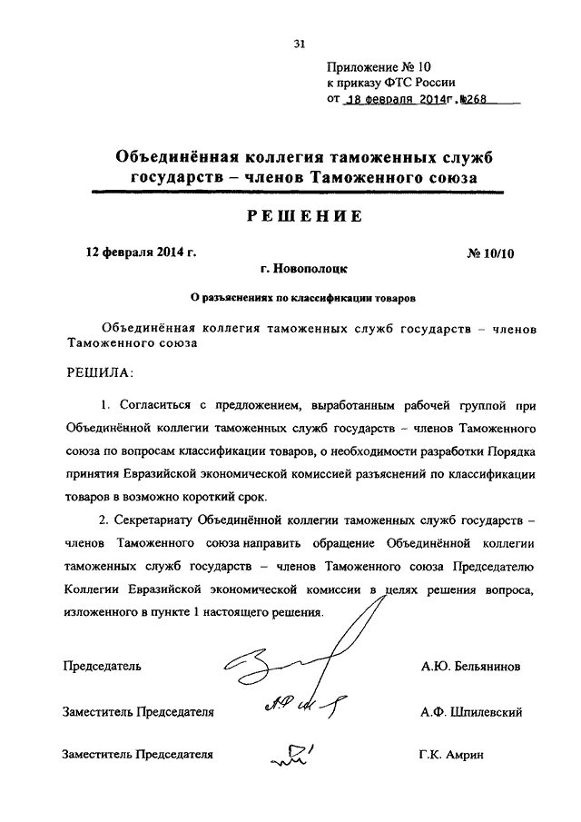 ПРИКАЗ ФТС РФ от 18.02.2014 N 268 "ОБ ОБЪЯВЛЕНИИ РЕШЕНИЙ ДЕСЯТОГО ЗАСЕДАНИЯ ОБЪЕДИНЕННОЙ КОЛЛЕГИИ
