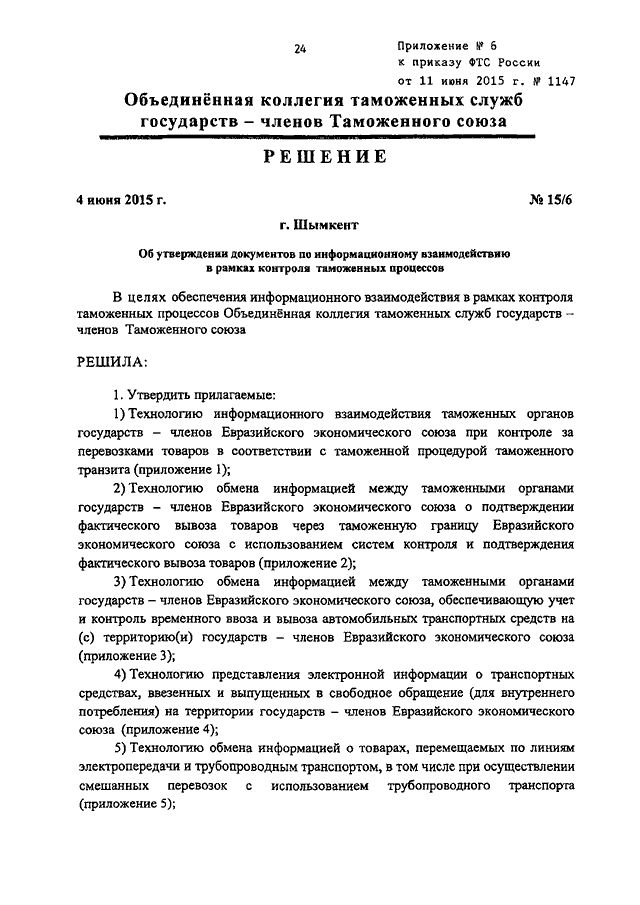 ПРИКАЗ ФТС РФ от 11.06.2015 N 1147