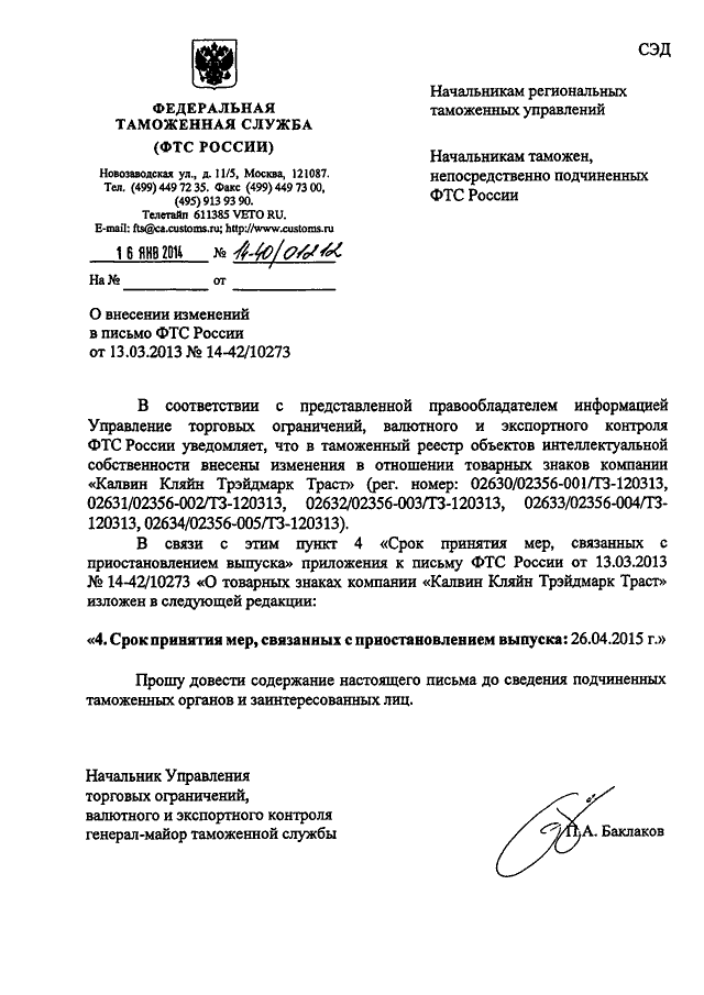 "О ВНЕСЕНИИ ИЗМЕНЕНИЙ В ПИСЬМО ФТС РОССИИ ОТ 13.03.2013 N 14-42/10273"
