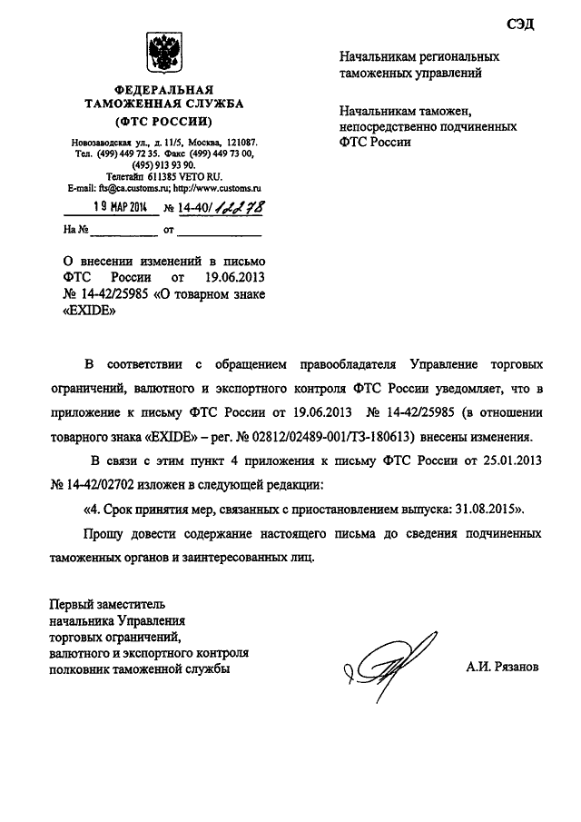 "О ВНЕСЕНИИ ИЗМЕНЕНИЙ В ПИСЬМО ФТС РОССИИ ОТ 19.06.2013 N 14-42/25985 "О ТОВАРНОМ ЗНАКЕ "EXIDE"