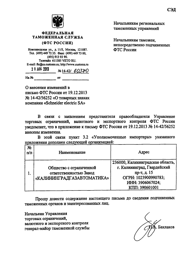 "О ВНЕСЕНИИ ИЗМЕНЕНИЙ В ПИСЬМО ФТС РОССИИ ОТ 19.12.2013 N 14-42/56252 "О ТОВАРНЫХ ЗНАКАХ КОМПАНИИ "SCHNEIDER ELECTRIC SA"