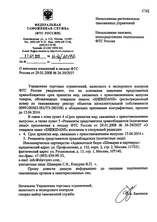 "О ВНЕСЕНИИ ИЗМЕНЕНИЙ В ПИСЬМО ФТС РОССИИ ОТ 29.01.2008 N 24-39/2927"