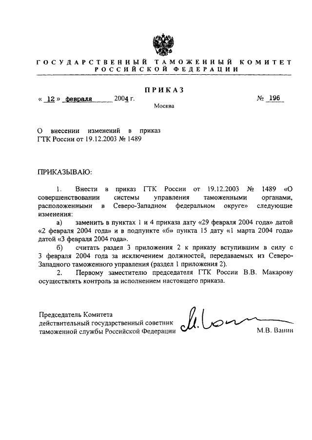 ПРИКАЗ ГТК РФ от 12.02.2004 N 196