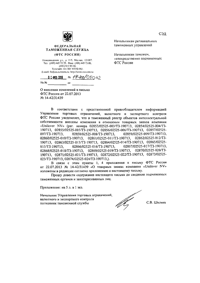 "О ВНЕСЕНИИ ИЗМЕНЕНИЙ В ПИСЬМО ФТС РОССИИ ОТ 22.07.2013 N 14-42/31439"