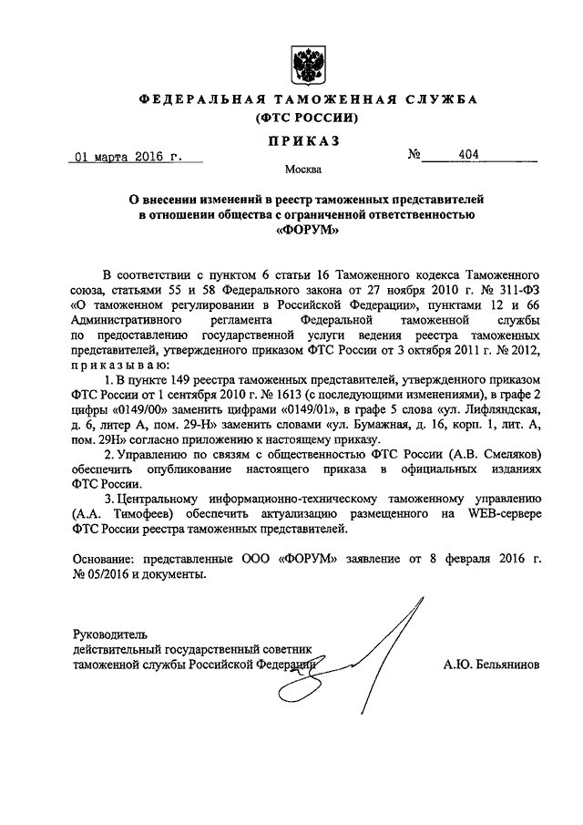 ПРИКАЗ ФТС РФ от 01.03.2016 N 404