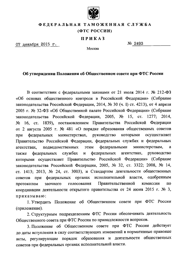 ПРИКАЗ ФТС РФ от 07.12.2015 N 2493