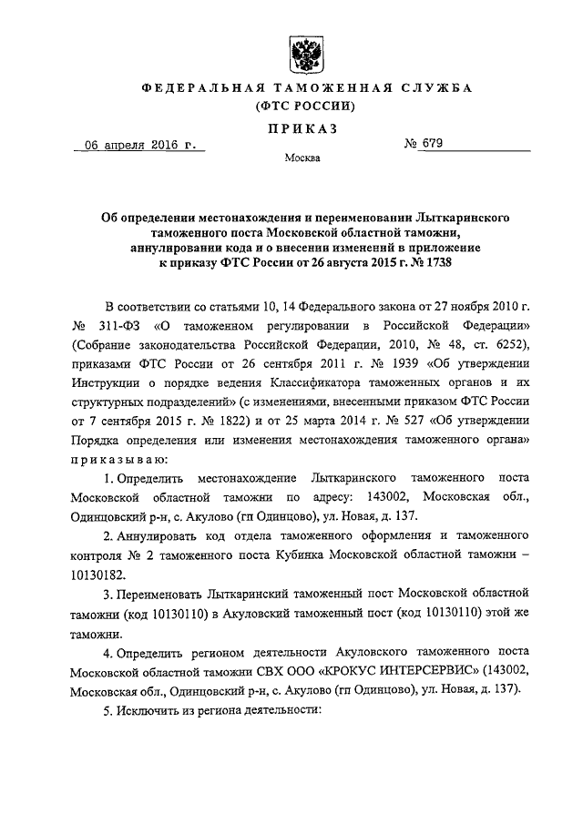 ПРИКАЗ ФТС РФ от 06.04.2016 N 679 "ОБ ОПРЕДЕЛЕНИИ МЕСТОНАХОЖДЕНИЯ И ПЕРЕИМЕНОВАНИИ ЛЫТКАРИНСКОГО