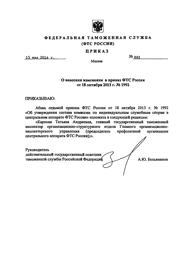 "О ВНЕСЕНИИ ИЗМЕНЕНИЯ В ПРИКАЗ ФТС РОССИИ ОТ 18 ОКТЯБРЯ 2013 Г. N 1992"