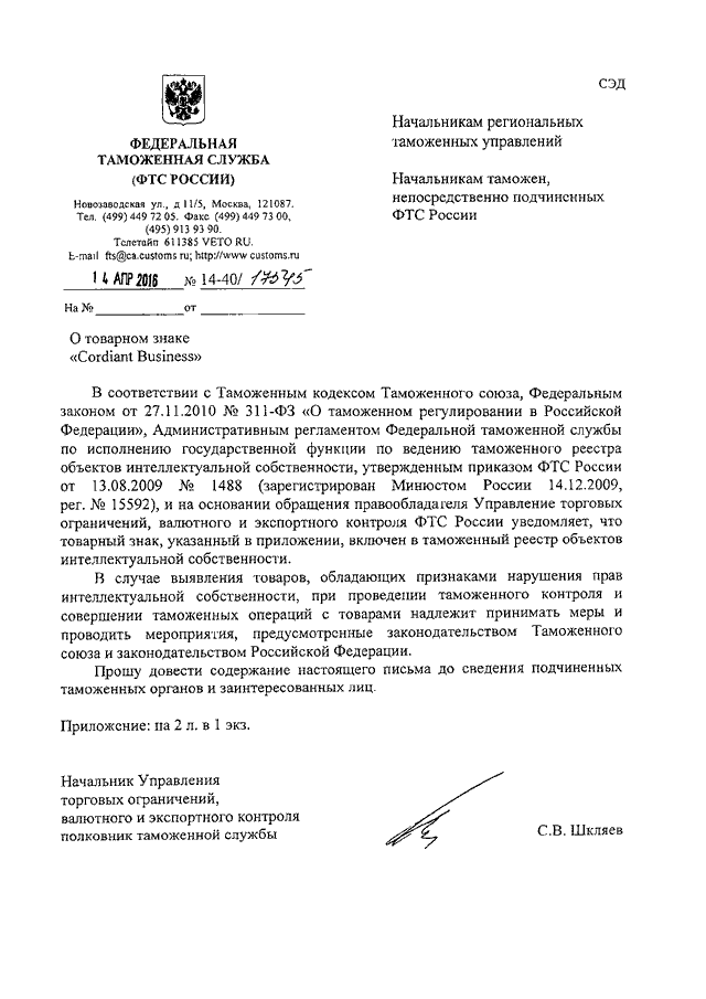 ПИСЬМО ФТС РФ от 14.04.2016 N 14-40/17545