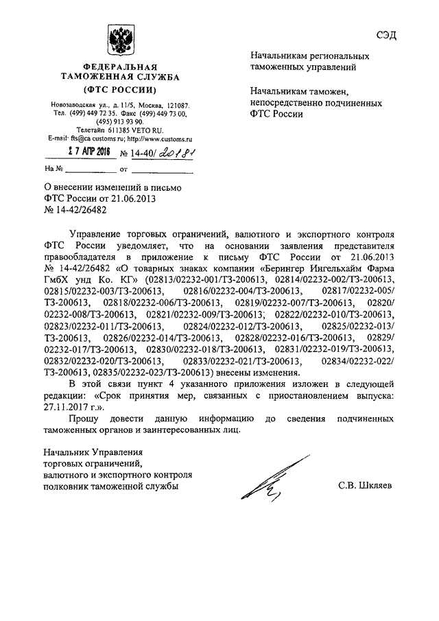 "О ВНЕСЕНИИ ИЗМЕНЕНИЙ В ПИСЬМО ФТС РОССИИ ОТ 21.06.2013 N 14-42/26482"