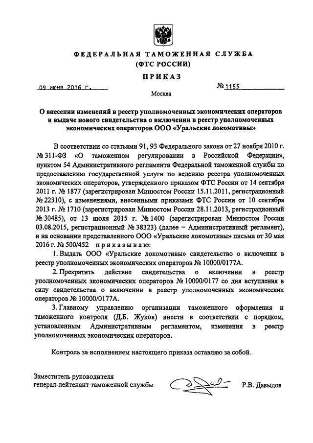 "О ВНЕСЕНИИ ИЗМЕНЕНИЙ В РЕЕСТР УПОЛНОМОЧЕННЫХ ЭКОНОМИЧЕСКИХ ОПЕРАТОРОВ И ВЫДАЧЕ НОВОГО СВИДЕТЕЛЬСТВА О ВКЛЮЧЕНИИ В РЕЕСТР УПОЛНОМОЧЕННЫХ ЭКОНОМИЧЕСКИХ ОПЕРАТОРОВ ООО "УРАЛЬСКИЕ ЛОКОМОТИВЫ"