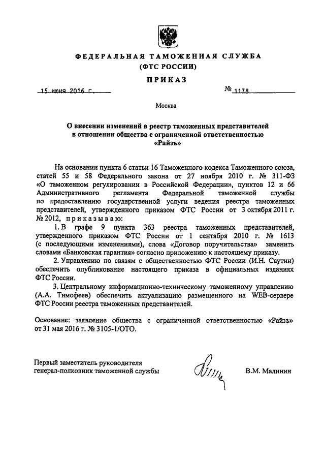 ПРИКАЗ ФТС РФ от 15.06.2016 N 1178