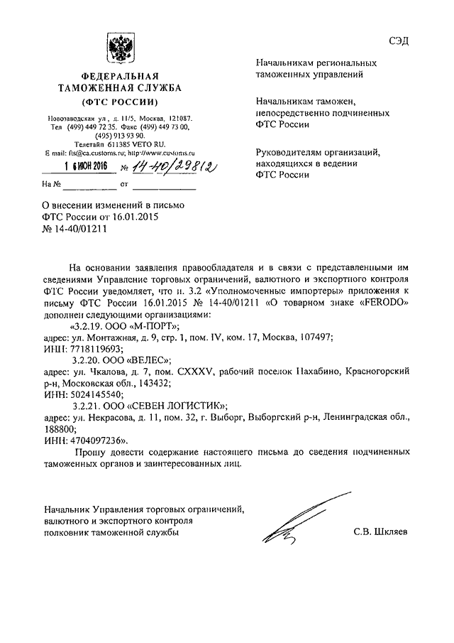 "О ВНЕСЕНИИ ИЗМЕНЕНИЙ В ПИСЬМО ФТС РОССИИ ОТ 16.01.2015 N 14-40/01211"
