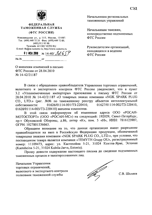 "О ВНЕСЕНИИ ИЗМЕНЕНИЙ В ПИСЬМО ФТС РОССИИ ОТ 28.04.2010 N 14-42/21187"