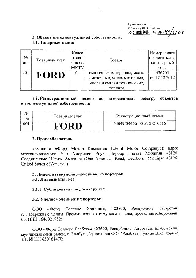 "О ТОВАРНОМ ЗНАКЕ "FORD"